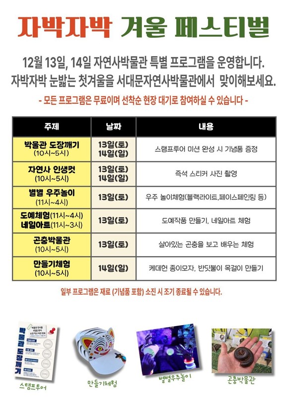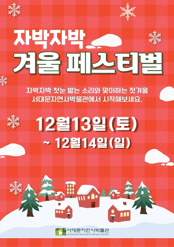 서울 서대문자연사박물관이 이달 13일과 14일 ‘자박자박 겨울 페스티벌’을 개최한다. 이를 통해 관람객들에게 자연사와 과학을 재미있게 접할 수 있는 다양한 프로그램과 특별한 문화 체험의 기회를 선사한다.