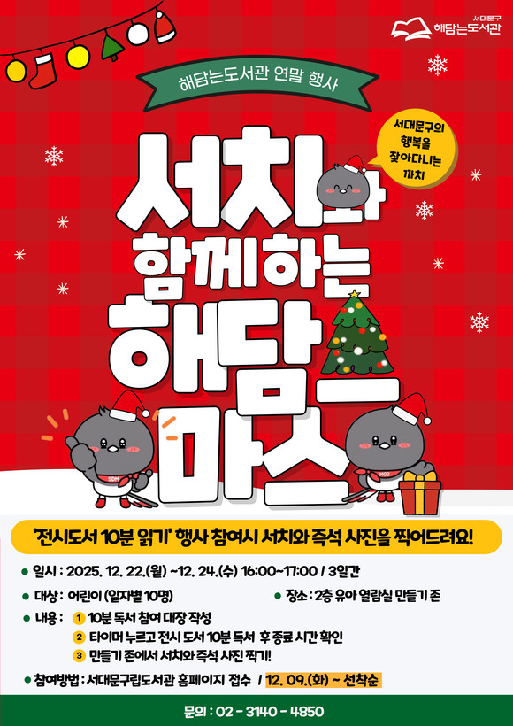 서울 서대문구(구청장 이성헌)가 독서문화 프로그램 ‘서치와 함께하는 해담스마스’를 이달 22∼24일 구립 해담는도서관에서 운영한다.