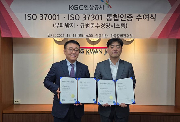 KGC인삼공사는 국제표준화기구 인증 기관인 한국준법진흥원으로부터 규범준수경영시스템(ISO 37301)과 부패방지경영시스템(ISO 37001) 통합인증을 획득했다고 16일 밝혔다.