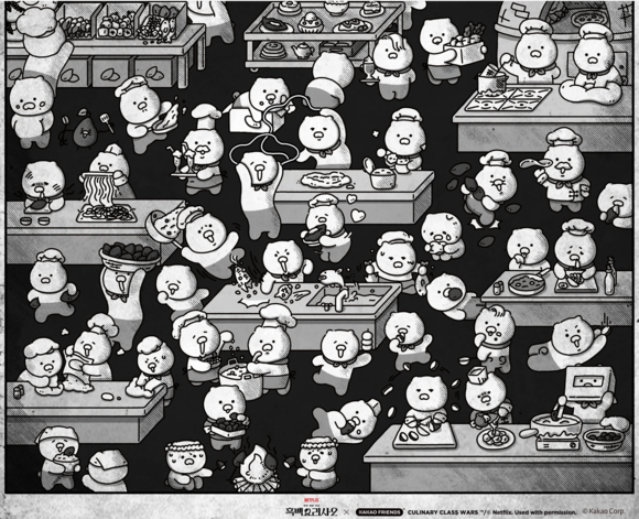 카카오프렌즈는 이어 넷플릭스 화제작 ‘흑백요리사2’와의 협업도 진행한다. 지난 11일부터 인스타툰 ‘춘식요리사’를 통해 춘식이가 ‘흑수저 요리사’로 참전하는 설정을 공개했다. 춘식이는 ‘춘슐랭 3스타’ 출신 셰프로 고구마 요리를 앞세운 ‘고구마카세’ 오너 셰프로 등장하며, 참가 닉네임은 이용자 투표를 통해 ‘냠냠펀치’로 결정됐다.