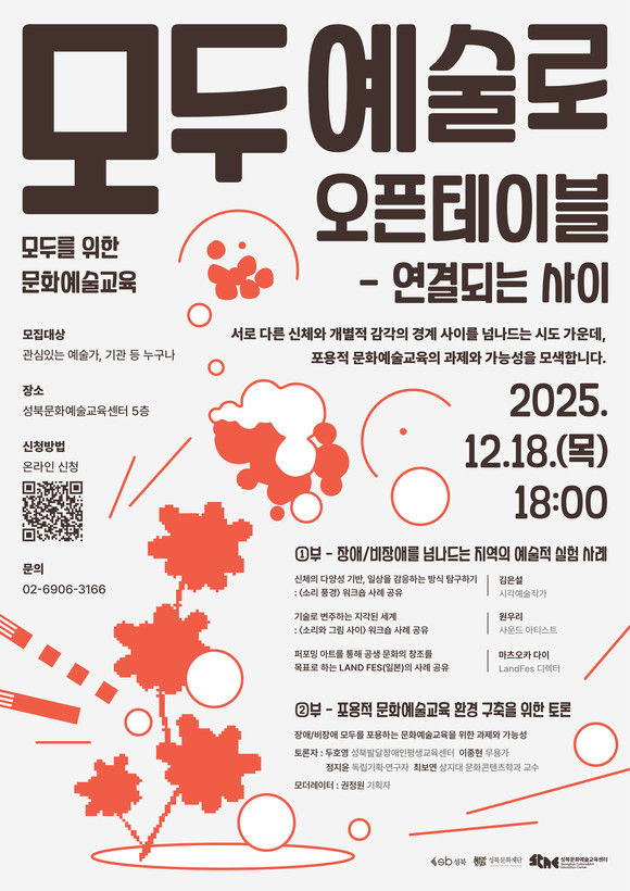 이어지는 종합토론에서는 ‘포용적 문화예술교육 환경 구축을 위한 제언’을 주제로, 장애·비장애를 아우르는 문화예술교육의 가능성과 한계를 예술가, 기획자, 매개자, 기관 등 다양한 시각에서 심도 있게 논의한다. 성북문화예술교육센터 발달장애 워크숍을 이끌어 온 권정원 기획자와 이종현 무용가를 비롯해 정지윤 독립기획·연구자, 최보연 상지대학교 문화콘텐츠학과 교수, 두호영 성북발달장애인평생교육센터 관계자 등이 패널로 참여해 현장과 학계를 아우르는 시사점과 과제를 제시할 예정이다.