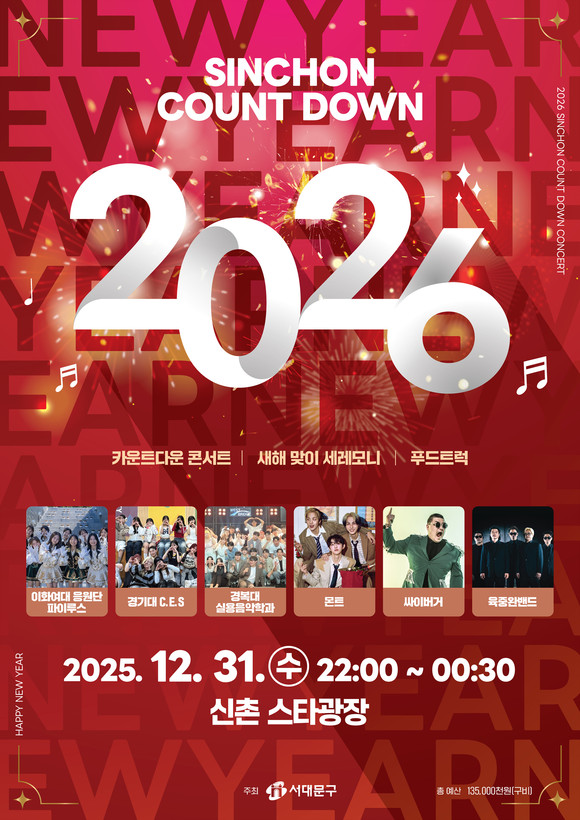 서울 서대문구(구청장 이성헌)가 올해의 마지막 날인 이달 31일 밤 10시부터 새해 첫날인 1월 1일 0시 30분까지 신촌 연세로 스타광장에서 ‘2026 신촌 카운트다운 콘서트’를 개최한다.