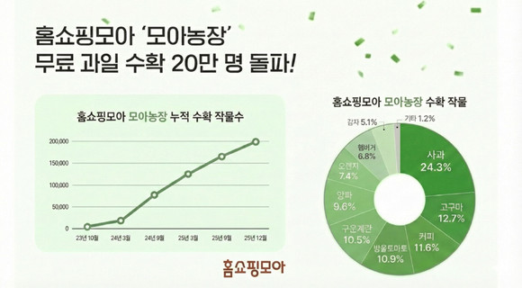모아농장은 사과를 비롯해 토마토와 오렌지 등 원하는 농작물을 선택해 키우면 실제 농작물을 무료로 받아 볼 수 있는 홈쇼핑모아 앱 내 미니게임으로 지난 2023년 10월 처음 서비스를 시작했다. 올해 들어 모아농장에서 매월 평균 1만여 명이 수확에 성공하며 무료로 과일을 집으로 배송 받고 있고, 이번 달 기준 누적 수확자는 20만 명을 돌파했다