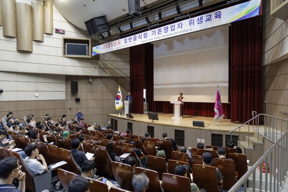 박강수 마포구청장이 2025 일반음식점 기존영업자 위생교육에서 인사말씀을 하고 있다. 사진=마포구청