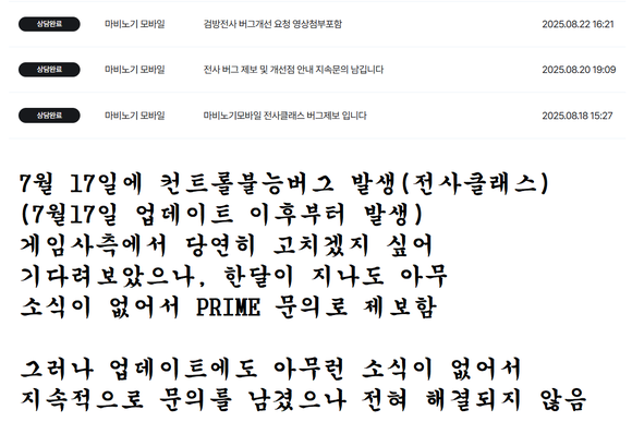 그럼에도 이들 역시 버그 제보나 운영 문의에 대해 성의 없는 매크로식 응답에 그쳤다는 증언이 이어졌다. 답변은 도착했지만, 그 안에는 구체적인 설명이나 처리 경과에 대한 공유가 없었다.