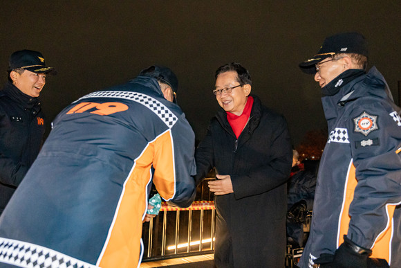 2025년 1월 1일 해맞이 현장(선유교)에서 현장 근무자들과 인사하는 최호권 영등포구청장. 사진=영등포구청