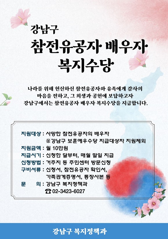 서울 강남구(구청장 조성명)가 1월 1일부터 고령 국가보훈대상자 지원을 늘리고, 참전유공자 배우자에 대한 지원 공백도 메운다. 90세 이상 보훈예우수당을 15만 원으로 인상하고, 참전유공자 배우자 복지수당(월 10만 원)을 새로 지급한다.