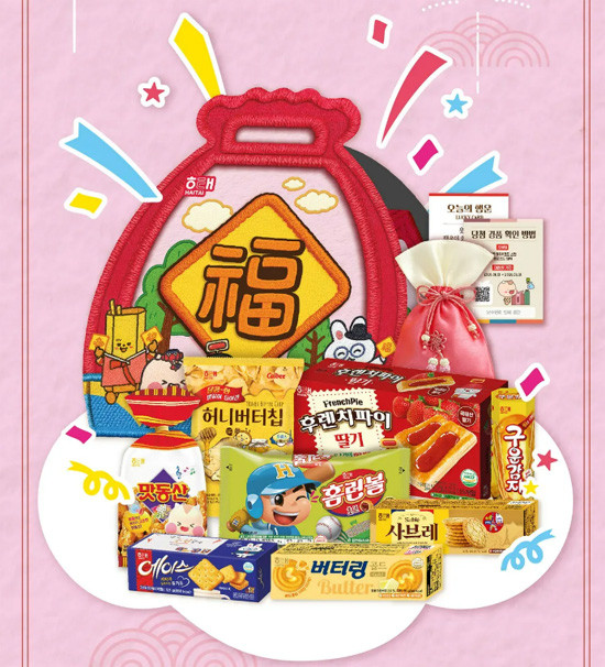 복주머니 선물세트는 파스텔 톤 컬러에 자수 실결과 박음질의 질감을 살려 한국식 감성을 표현했다. 해태제과의 인기 캐릭터들도 한복을 입고 등장한다. 구운감자의 ‘꾸니’, 맛동산의 ‘깨비’, 후렌치파이의 ‘후야’, 허니버터칩의 ‘허비’, 에이스의 ‘티토’가 새해 인사를 건네며 행운을 나눈다.
