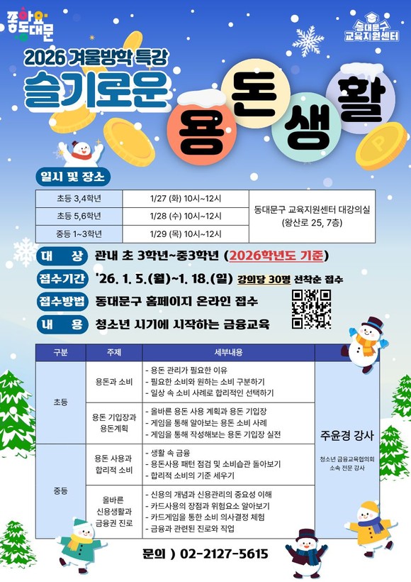 서울 동대문구(구청장 이필형)는 겨울방학을 맞아 초·중학생을 대상으로 ‘과목별 학습법’과 ‘슬기로운 용돈생활’ 특강을 운영한다고 7일 밝혔다. 방학 동안 흐트러지기 쉬운 학습 리듬을 다시 잡고, 청소년기에 꼭 필요한 기초 금융 감각까지 함께 키우도록 ‘학습·금융’ 두 축을 한 프로그램에 담은 것이 특징이다. 강의는 동대문구 교육지원센터(왕산로 25, 7층)에서 진행된다.