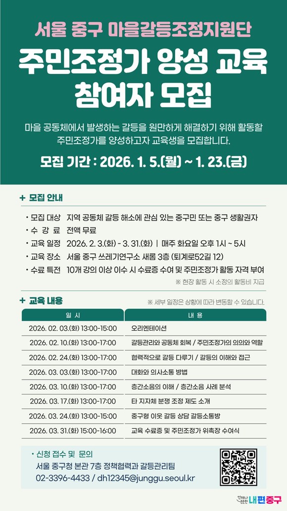 서울 중구가 주민 스스로 갈등을 조정하고 마을의 신뢰를 회복할 수 있도록 돕는 ‘주민조정가’를 양성해 따뜻한 공동체 문화를 만들어가고 있다. 구는 2024년 마을갈등조정지원단 제1기 주민조정가에 이어, ‘제2기 주민조정가 신규 양성 교육’에 참여할 교육생을 공개 모집한다.