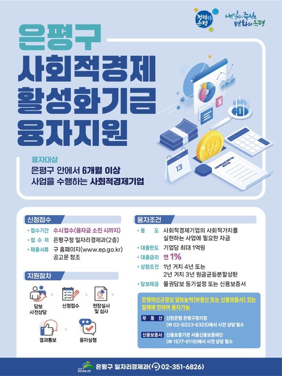서울 은평구(구청장 김미경)는 사회적경제기업의 성장과 경영 안정을 돕기 위해 ‘사회적경제활성화기금 융자 지원사업’을 실시한다고 밝혔다.