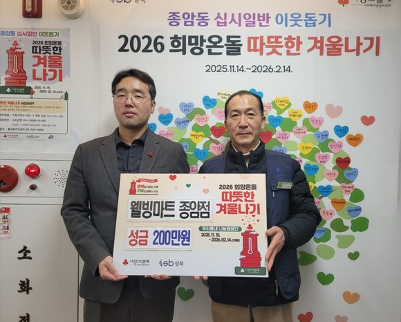 종암동에서는 웰빙마트 종암점이 취약계층 지원을 위해 성금 200만원을 기탁했다. 성금은 지난 6일 종암동 주민센터를 통해 전달됐으며, 웰빙마트 종암점은 매년 ‘따뜻한 겨울나기’ 캠페인에 참여하고 있다.