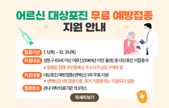 서울 성동구(구청장 정원오)는 2026년 1월 1일부터 65세 이상 어르신을 대상으로 대상포진 무료 예방접종을 실시한다고 밝혔다. 접종 대상은 1961년 12월 31일 이전 출생자로, 성동구에 주민등록을 둔 구민이다.