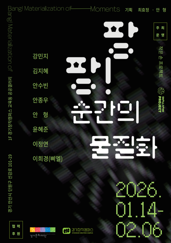 경기문화재단 경기창작캠퍼스는 작은 손 프로젝트(대표 최효정)와 함께 1월 14일(수)부터 2월 6일(금)까지 경기창작캠퍼스 교육동 1층 공공갤러리에서 《팡팡! 순간의 물질화》 전시를 선보인다.