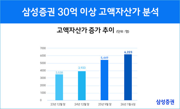 다각화된 상품 포트폴리오를 바탕으로 삼성증권은 업계 최초로 금융자산 30억 원 이상 고객 6000명 시대를 열었다. 13일 삼성증권에 따르면 금융자산 30억 원 이상의 ‘초고액자산가’ 고객 수는 6223명(1월 6일 기준)으로, 2024년 말 대비 58.2% 증가했다.