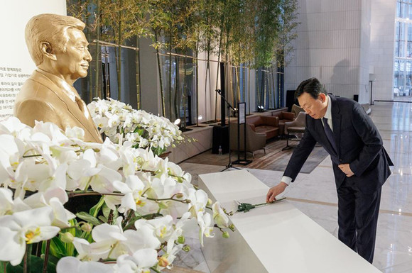 신동빈 롯데 회장이 15일 롯데월드타워 1층에 위치한 신격호 롯데 창업주 흉상에 헌화하고 있다. 롯데는 이날 올 상반기 VCM에 앞서 신 창업주 서거 6주기를 추모하며 경영철학과 창업정신을 되새기는 시간을 가진다. 사진=롯데지주