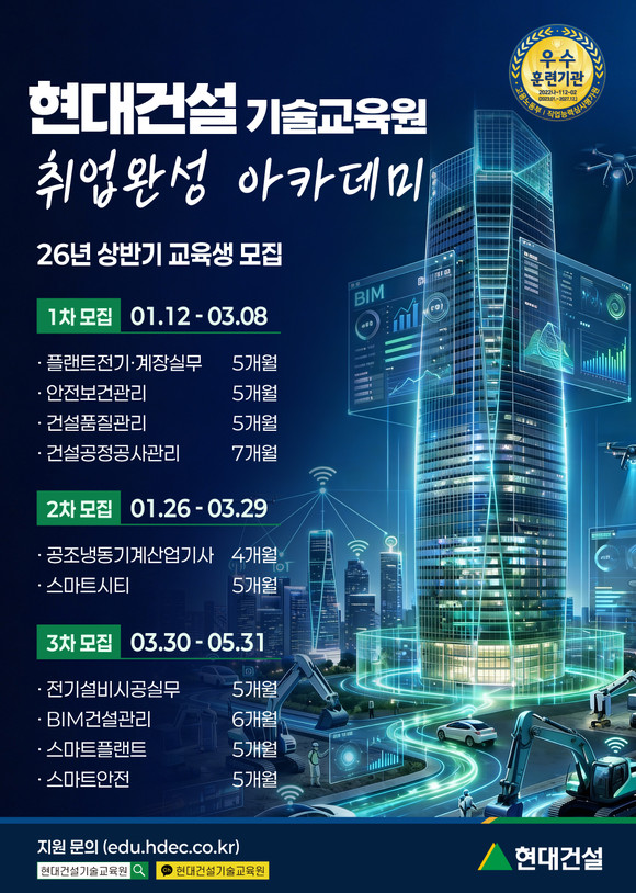 현대건설 기술교육원이 미래 건설 산업을 이끌어갈 혁신 인재를 육성하고자 ‘2026년 상반기 취업완성 아카데미’ 기술교육생을 모집한다.