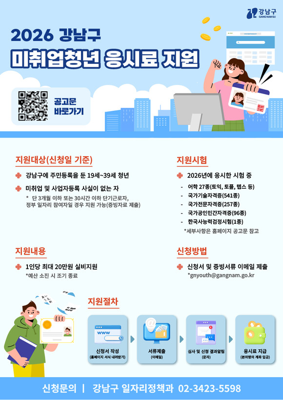 조성명 강남구청장은 “지난해 수요가 컸던 만큼, 올해는 지원 규모를 크게 늘려 청년들의 도전을 응원하겠다”며 “취업 준비 과정에서 반복적으로 발생하는 응시료 부담을 줄이고, 청년들이 필요한 역량을 쌓을 수 있도록 지원을 넓혀 나가겠다”고 밝혔다.