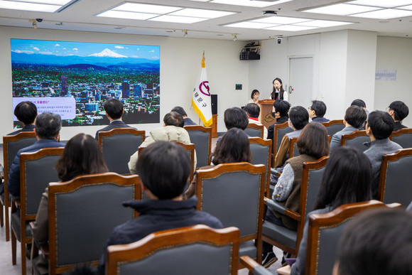 서울 동대문구(구청장 이필형)는 22일 구청 5층 기획상황실에서 구청장과 전 직원을 대상으로 ‘2025년 포틀랜드 단기국외훈련 성과보고회’를 열고, 미국 포틀랜드주립대학교(PSU)에서 6개월간 진행된 훈련 결과를 공유했다. 구는 이번 보고회를 “해외 사례를 ‘구경’이 아니라 ‘적용 가능한 해법’으로 바꾸는 과정”에 초점을 맞춘 자리로 규정하며, 글로벌 감각과 창의적 문제 해결 역량을 행정 현장에 연결하겠다는 방침을 밝혔다.
