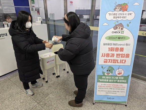 탄소중립 선도도시 서울 성북구(구청장 이승로)가 2026년 병오년 새해를 맞아 구청 로비에서 ‘일회용 컵 제로(zero) 청사 만들기’ 캠페인을 실시했다.