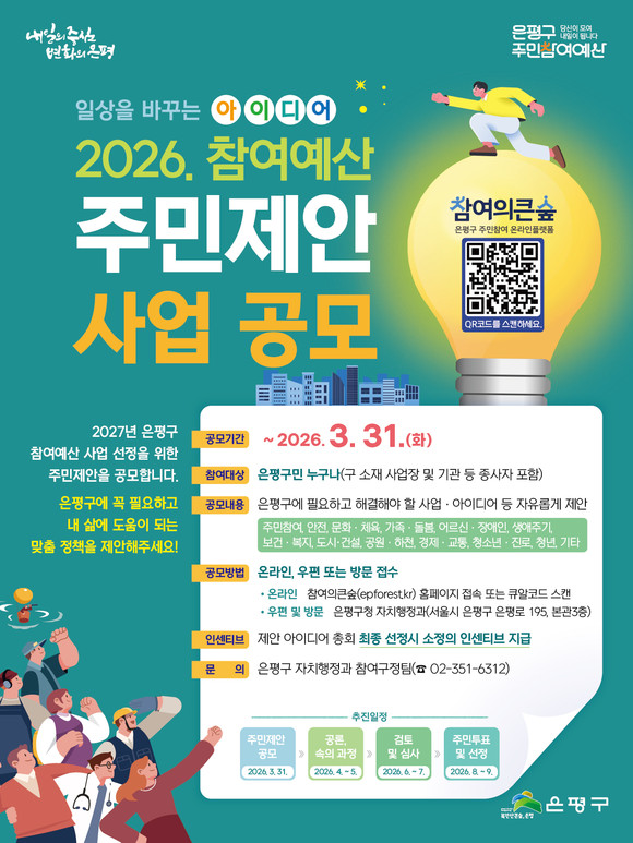 서울 은평구(구청장 김미경)는 오는 3월 31일까지 ‘참여예산 주민제안 사업공모’를 진행한다고 밝혔다.