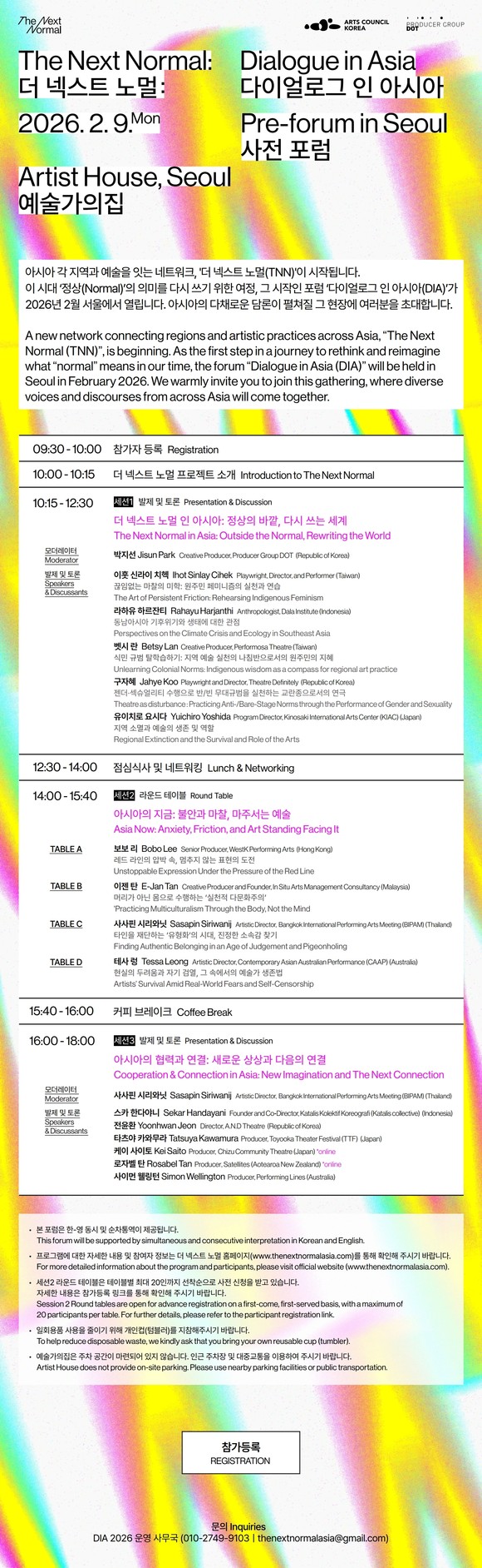 본 포럼은‘정상(Normal)’이라는 개념을 동시대적 관점에서 다시 사유하고 새로운 협력 방향을 모색하는 자리로, 아시아 공연예술 현장에서 오랫동안 축적되어 온 문제의식과 교류를 바탕으로 기획되었다. ▲ 첫 번째 세션에서는 식민 규범의 탈학습, 젠더, 지역 소멸, 기후 위기 등 아시아가 직면한 다양한 이슈들을 토대로, 여러 관점에서 ‘정상’의 경계를 재설정하는 발제와 토론이 진행된다. ▲ 두 번째 세션은 소규모 라운드 테이블 형식으로 진행되며, 자기검열과 표현의 가치, 다문화주의, 유형화와 고립, 예술가의 생존과 위험 회피 등 아시아 각국이 마주한 불안과 마찰을 주요 키워드로 삼아 아시아 동시대 예술의 현실을 공유하고 질문하는 시간을 갖는다. 마지막으로 ▲ 세 번째 세션에서는 지속 가능한 창작과 연대를 위한 새로운 레지던시 모델과 협력 방식을 중심으로, 아시아 공연예술 생태계에서의 레지던시의 가치와 확장 가능성에 대해 살펴본다.