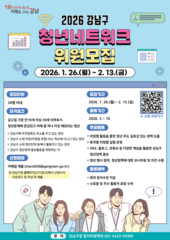 서울 강남구(구청장 조성명)가 ‘청년네트워크’ 7기 위원을 2월 13일까지 공개 모집한다. 올해 7기는 청년 정책 리빙랩과 청년의 날 행사를 연계하는 운영 방식을 도입해 정책 아이디어의 현장성과 체감도를 높일 계획이다.