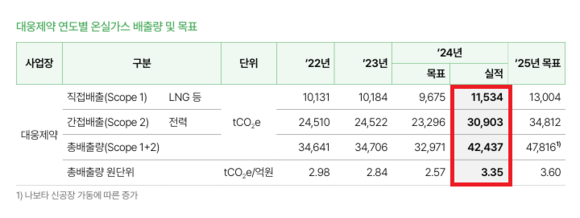 2024년 LNG 등 연료 사용에 따른 온실가스 직접배출(Scope 1)은 1만1534tCO2e(이산화탄소 환산톤)로, 전년 대비 5% 감축한 9675tCO2e를 목표로 했으나 실제 배출량은 목표 대비 19.2% 증가했다. 전력 사용에 따른 간접배출량(Scope 2)도 5% 감소한 2만3296tCO2e를 목표로 했지만, 실제 배출량은 3만903tCO2e로 목표치보다 32.6% 늘었다.