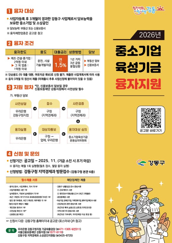 먼저, 구는 중소기업 육성기금 융자지원 사업을 시행하고 있다. 중소기업과 소상공인 대상으로 사업자금을 대출하며, 총 30억 규모로 상반기에 21억원(70%) 대출 실행을 목표하고 있다. 대출 한도는 최대 2억원, 상환조건은 1년 거치, 3년 균등 분할상환이다. 금리는 연1.5%의 저금리가 적용되며, 중도 상환 수수료 면제, 원금 분할 상환 횟수를 기존 연 2회에서 연 4회로 늘리는 등 금융 부담도 낮췄다.