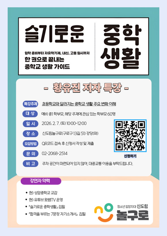 ‘신도림놀구로’에서는 예비 중학생 학부모를 위한 ‘슬기로운 중학 생활’ 황유진 저자 특강이 열린다. 오전 10시부터 두 시간 동안 진행되는 이번 강연은 중학교 생활의 주요 변화와 학습 환경 등을 소개해 학부모의 이해를 돕고, 자녀 지도에 실질적인 도움을 주는 내용으로 구성됐다.