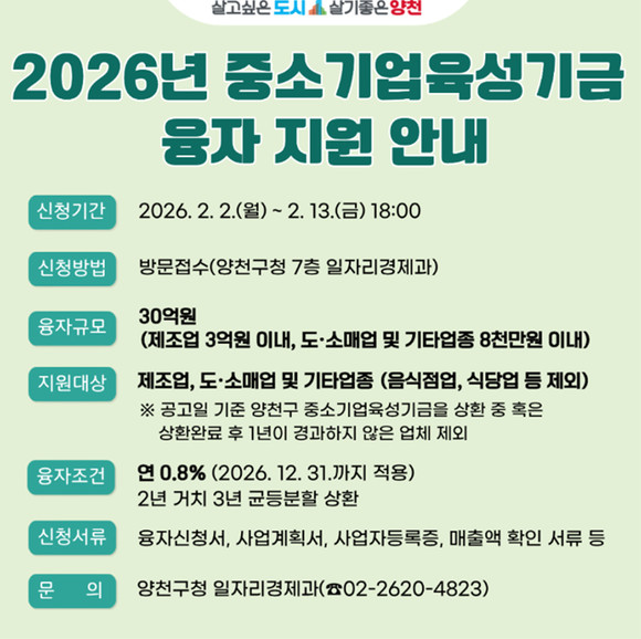 서울 양천구(구청장 이기재)는 경기침체 장기화로 경영 부담이 가중되고 있는 중소기업과 소상공인의 자금난 완화를 위해 2026년 상반기 30억 원 규모의 ‘중소기업 육성기금’ 융자 지원에 나선다고 3일 밝혔다.