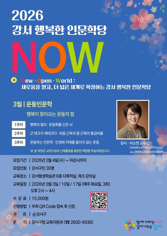 신청은 오는 4일(수)부터 선착순으로 접수하며, 정원 마감 시 조기 종료될 수 있다. 전체 수강료는 1만 5천 원이며, 접수 및 일정 등 자세한 사항은 강서구청 누리집(공시/새소식)에서 확인할 수 있다.