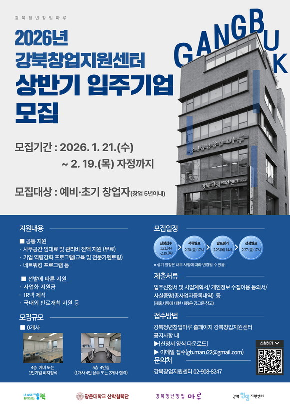 한편, 강북창업지원센터는 오는 19일까지 2026년 상반기 신규 입주기업을 모집한다. 모집 대상은 15세 이상 예비창업자 및 창업 5년 이내 초기 창업기업으로, 심사에서는 성장 가능성과 사업 실행력을 중심으로 평가할 예정이다.
