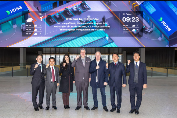 스티븐 퓨어 캐나다 국방조달장관(왼쪽 다섯 번째) 일행이 HD현대 글로벌R&D센터에서 기념촬영을 하고 있다. 장관 오른쪽이 박용열 HD현대중공업 함정사업본부장. 사진=HD현대