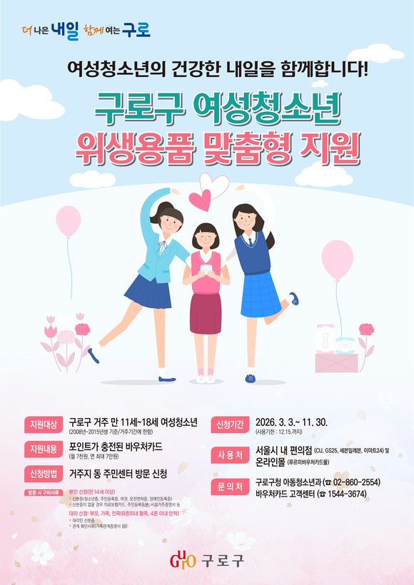 서울 구로구(구청장 장인홍)가 3월부터 관내 여성청소년을 대상으로 생리용품(위생용품) 바우처 지원 사업을 시행한다. 구는 기존 학교·청소년시설 비치 방식에서 바우처카드 방식으로 전환해 청소년의 이용 편의와 제품 선택권을 강화했다.