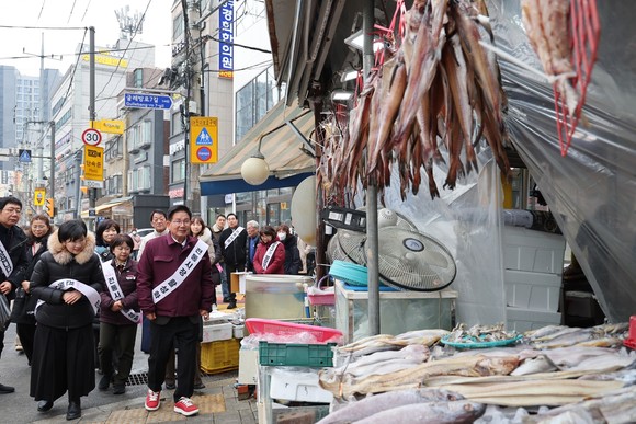박강수 마포구청장이 설 명절을 맞아 전통시장을 둘러보고 있다. 사진=마포구청