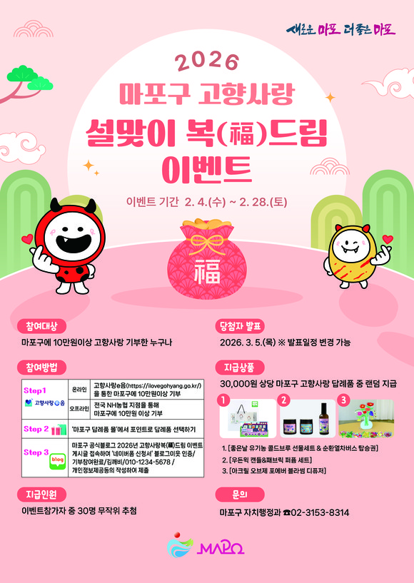 서울 마포구(구청장 박강수)는 설 명절을 맞아 고향사랑기부제 참여를 확대하고 기부 문화를 확산하기 위해 ‘2026년 설맞이 고향사랑 복(福)드림 이벤트’를 2월 4일부터 28일까지 운영한다.