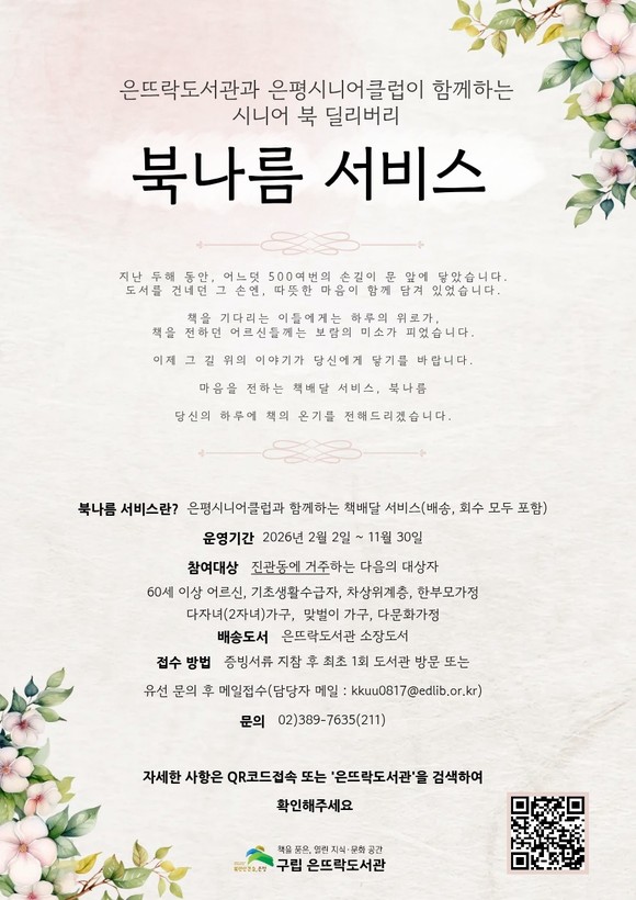 김미경 은평구청장은 “북나름 서비스 확대 운영을 통해 더 많은 주민이 일상 속에서 책을 가까이할 수 있게 됐다”며 “어르신 일자리와 지역 돌봄을 함께 아우르는 사업으로 지속 발전시켜 나가겠다”고 밝혔다.