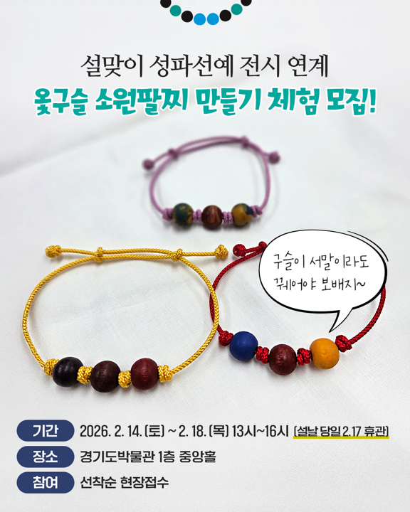 경기문화재단 경기도박물관(관장 직무대행 박본수)은 설날을 맞아 관람객이 참여할 수 있는 체험 프로그램 ‘구슬이 서말이라도 꿰어야 보배지’를 운영한다. 2월 14일(토)부터 18일(목)까지 진행되며 설날 당일(2월 17일)에는 운영하지 않는다. 체험은 오후 1시~4시, 경기도박물관 1층 중앙홀에서 열린다.