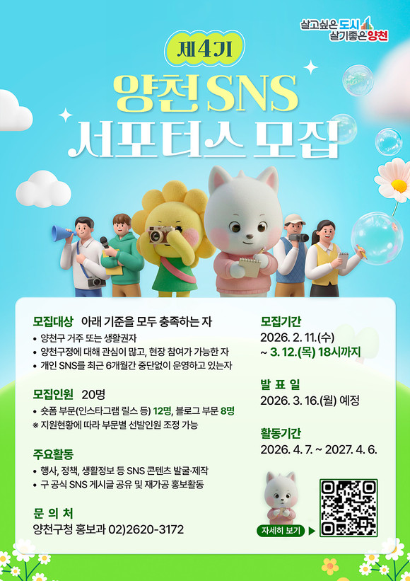 서울 양천구(구청장 이기재)가 구정 소식을 주민의 시선으로 생동감 있게 전달할 ‘제4기 양천 SNS 서포터스’를 3월 12일까지 모집한다. 선발인원은 총 20명으로, 숏폼 부문(인스타그램 릴스 등) 12명과 블로그 부문 8명이다.