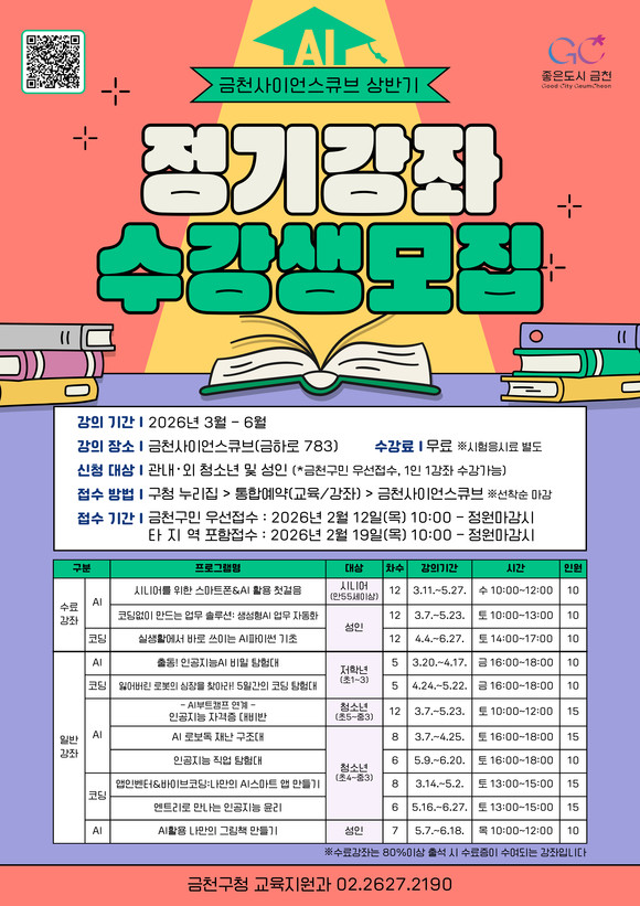 유성훈 금천구청장은 “금천사이언스큐브 정기강좌는 인공지능(AI)과 코딩 등 미래기술을 일상 속에서 쉽게 접하고 배울 수 있도록 마련한 프로그램”이라며, “청소년부터 시니어까지 각자의 수준과 관심에 맞는 강좌를 선택해 미래 역량을 키우는 기회가 되길 바란다”라고 말했다.
