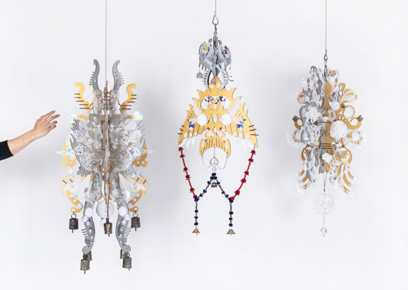 Birch plywood, wood stain, stainless steel components, hanji, marbled paper, honeycomb paper balls, pearls, metal bells, Punjabi earrings and ornaments, stainless steel chains, split rings, steel wire ropes, swivels 3 parts; 89 x 28 x 43 cm, 101 x 49 x 56 cm, 114 x 54 x 54 cm