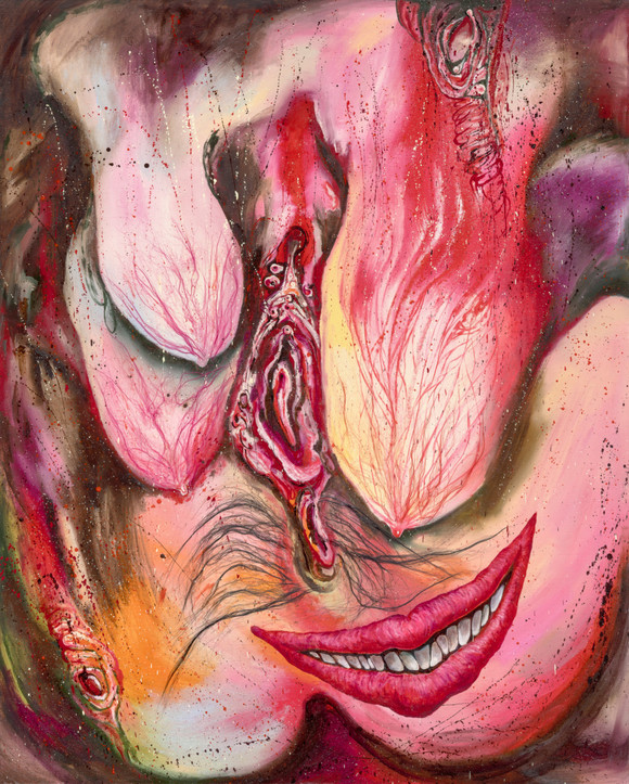 장파(b. 1981) 〈Gore Deco – A Split Smile〉 2026 Oil, human hair on linen 162.2 x 130.3 cm