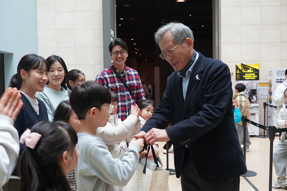 관람객에게 축하 선물을 증정하는 유홍준 국립중앙박물관장. 사진=국립중앙박물관
