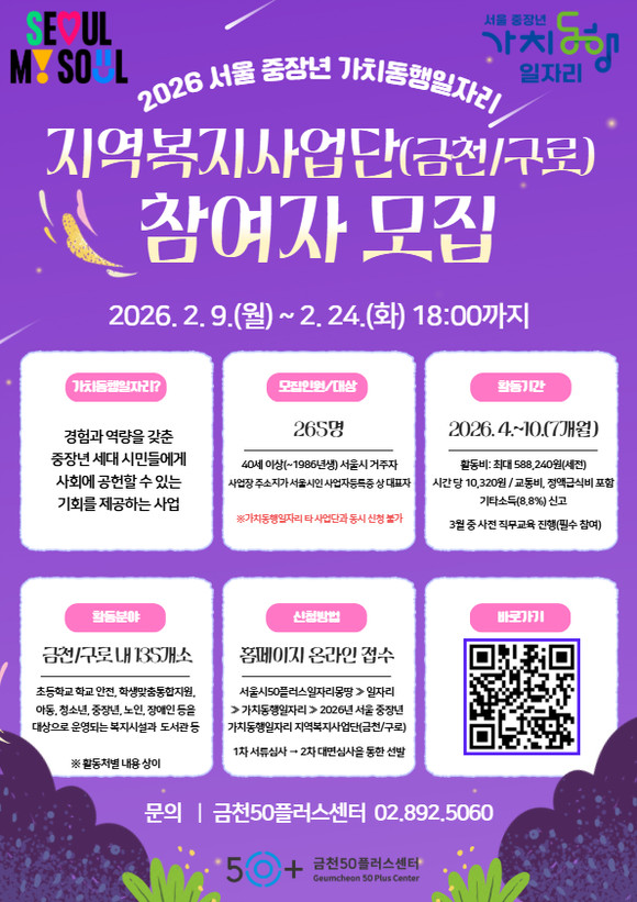 서울 금천구(구청장 유성훈)는 금천50플러스센터(센터장 김미성)에서 경험과 역량을 갖춘 중장년 세대들에게 지속적인 사회참여를 지원하기 위해 ‘2026년 서울 중장년 가치동행일자리사업’ 참여자를 모집한다고 밝혔다.