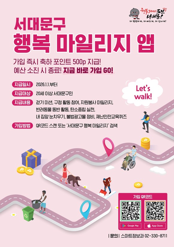 ‘서대문구 행복 마일리지’는 걷기, 자원봉사, 반려동물 동반 활동, 탄소중립 실천, 내 집 앞 눈 치우기 등 다양한 일상 활동을 포인트로 적립해 주는 ‘지자체 최초의 포인트 통합관리 플랫폼’이다. 포인트 지급은 20세 이상 서대문구민을 대상으로 이뤄진다.