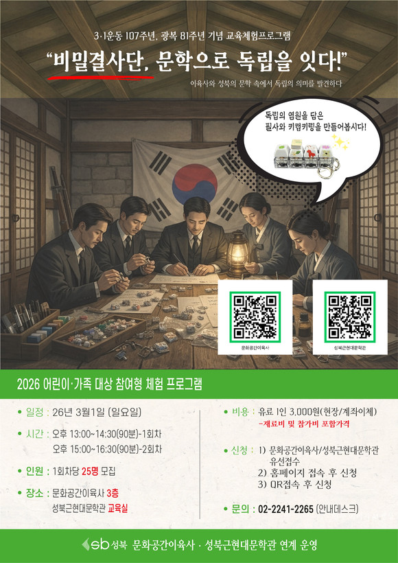 이승로 성북구청장은 “3·1절을 맞아 독립의 의미를 문학과 연결해 가족이 함께 체험할 수 있도록 기획했다”며 “지역 문화공간이 생활 속 역사교육의 장이 되도록 지속적으로 연계 프로그램을 이어갈 계획이다”고 밝혔다.
