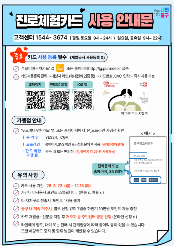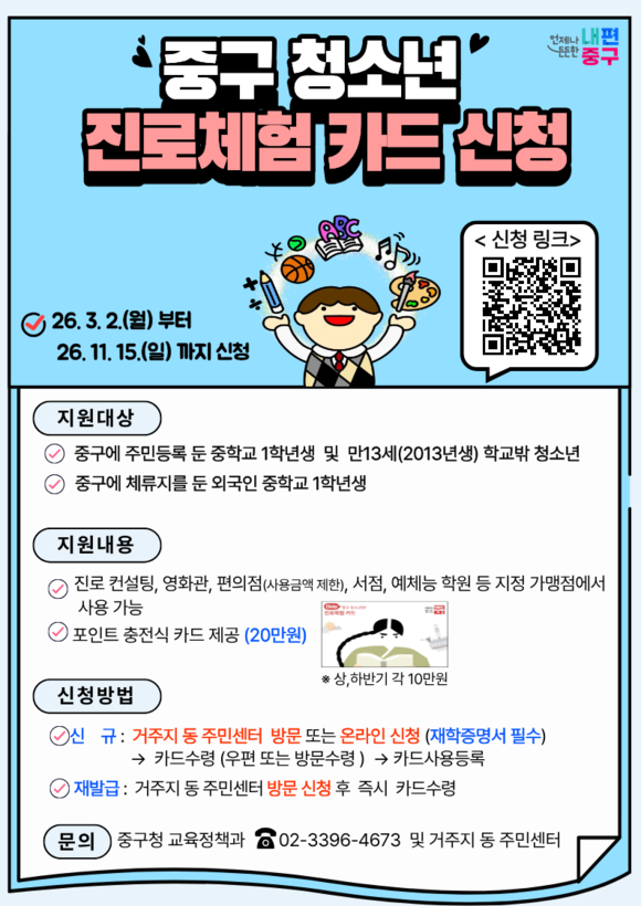 서울 중구가 지역 청소년들의 다양한 진로 탐색과 문화·예술 체험 기회를 확대하기 위해 ‘청소년 진로체험카드’를 지급한다.