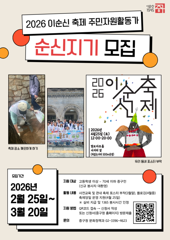 이순신 장군의 탄생지 서울 중구가 4월에 있을 <2026 이순신 축제>에서 활약할 주민자원활동가 ‘순신지기’와 ‘중구 소년 이순신’을 선발한다.