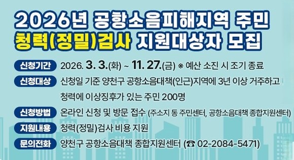 이기재 양천구청장은 “공항소음 피해지역 주민들이 겪는 불편을 조금이라도 덜어드리고 삶의 질을 높이기 위해 실질적인 지원을 지속적으로 확대하고 있다”며 “앞으로도 주민들이 체감할 수 있는 정책을 적극 발굴해 생활 안정에 도움이 되도록 최선을 다하겠다”고 말했다.